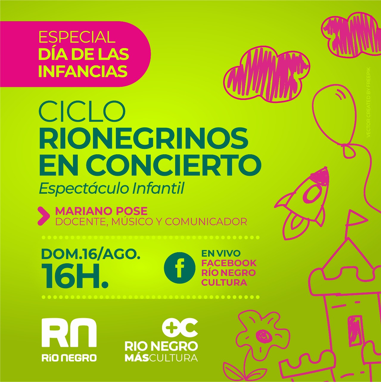 Por otra parte, a las 16 en el Facebook de Río Negro Cultura se llevará a cabo una edición especial del ciclo Rionegrinos en Concierto con un espectáculo infantil que estará encabezado por Mariano Pose, un docente, músico y comunicador con una carrera basada en el trabajo con los niños.