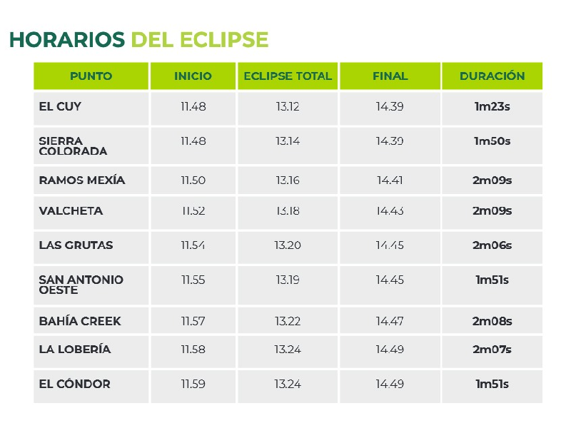 En Bahía Creek, el punto máximo se vivirá un par de minutos después, a las 13.22 con una duración de 2m08s. Luego será el turno de La Lobería (13.24, con 2m07s de duración) y El Cóndor (13.24, con 1m51s de duración).